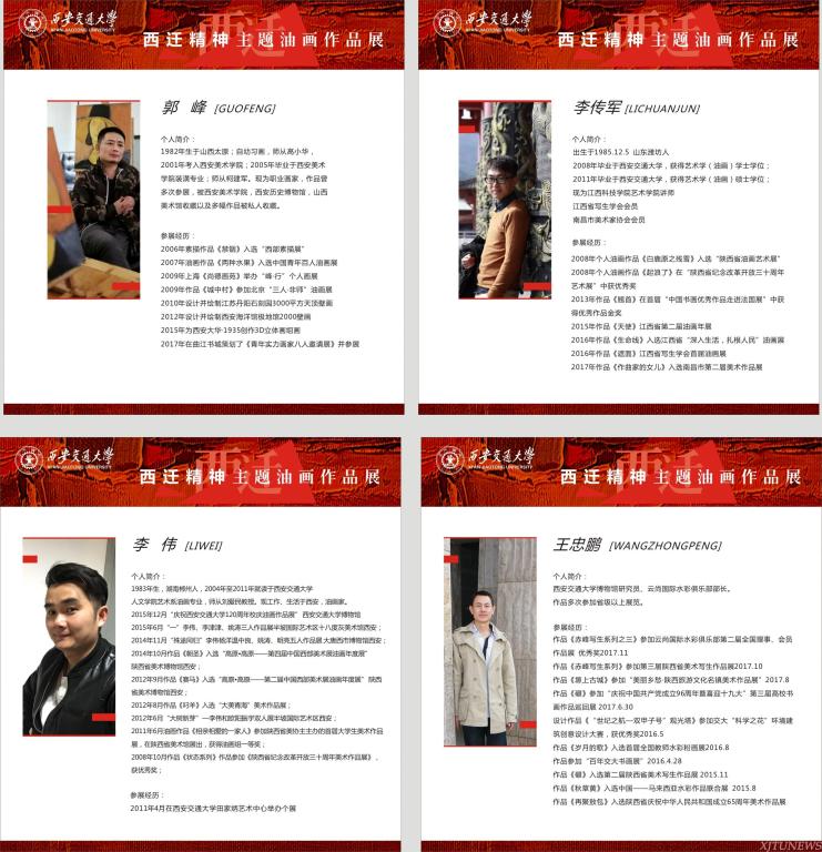 走在交大的梧桐道上,但见两排粗壮的法国梧桐树冠相接,以高举的U字型掩映天空。初春的嫩叶衬着苍劲的树干,把阳光切成斑驳闪烁的碎片,洒在这条仿佛走不完的路上。远隔一段红尘,仿佛一幅宁静幽深的油画。不时有急驰的汽车驶过,年轻的孩子们三三两两,嬉闹笑语走过,但却没有喧嚣的感觉,也许是静静的梧桐稀释了各种噪音。如果你沿着梧桐绿荫,往校园的西二楼西南侧,也即机械学院方向走,走到尽头,就来到了交大迁校60周年纪念校门和西迁广场,这里矗立了一个巨大的红色展板“西迁精神主题油画展”。在旁边有一个不规则的玻璃房子,拾级而上,你会走入一个布满了西迁写实油画的展厅。以2018年4月8日校庆为契机,由西安交大校友、职业画家李伟组建创作团队,为母校完成了一批高水平高质量的油画肖像和群像作品,一期完成27幅油画,共完成40多平方米,其中巨幅2幅,将在4月8日开展,展期半个月。